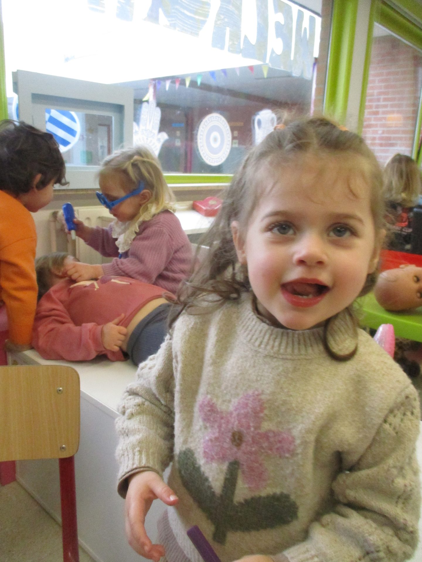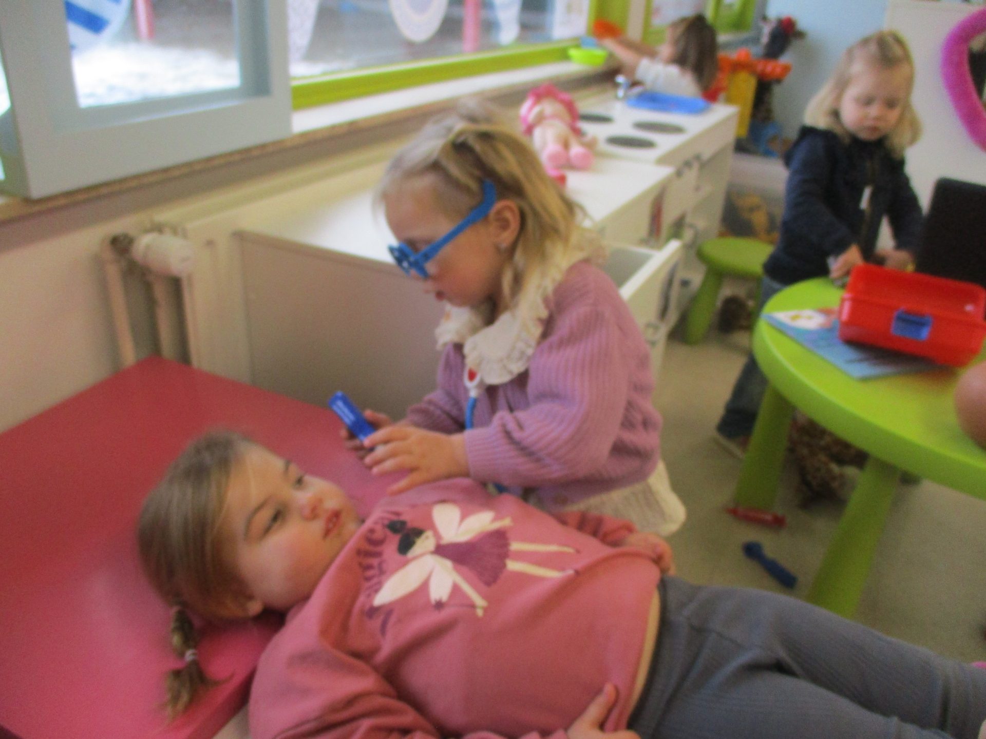 In het poppenhuisje werd er volop gespeeld met de doktersspullen. Niet alleen de popjes werden verzorgd, ook de kindjes maakten elkaar weer beter, zo fijn om te zien hoe zorgzaam en betrokken ze bezig waren.