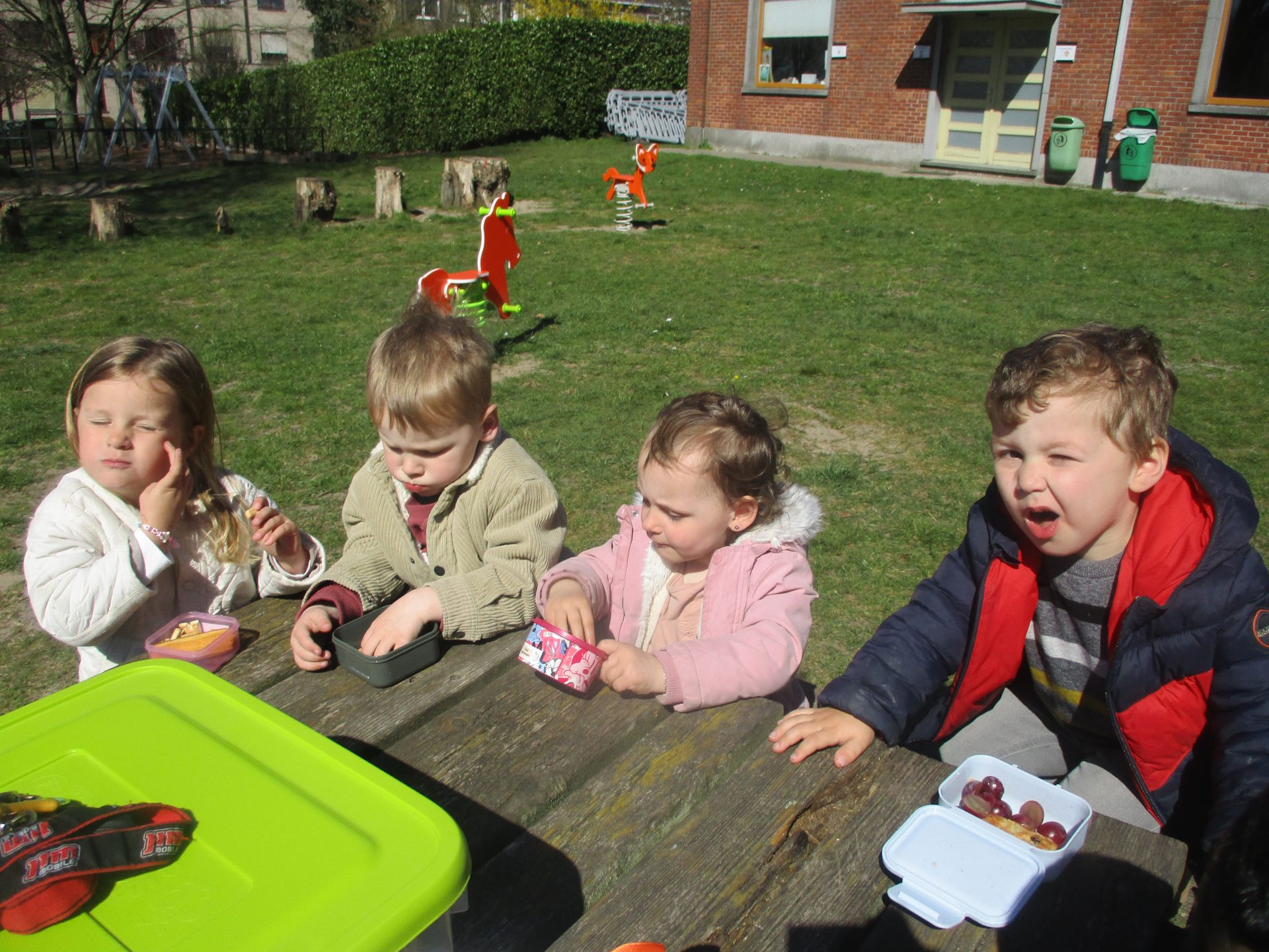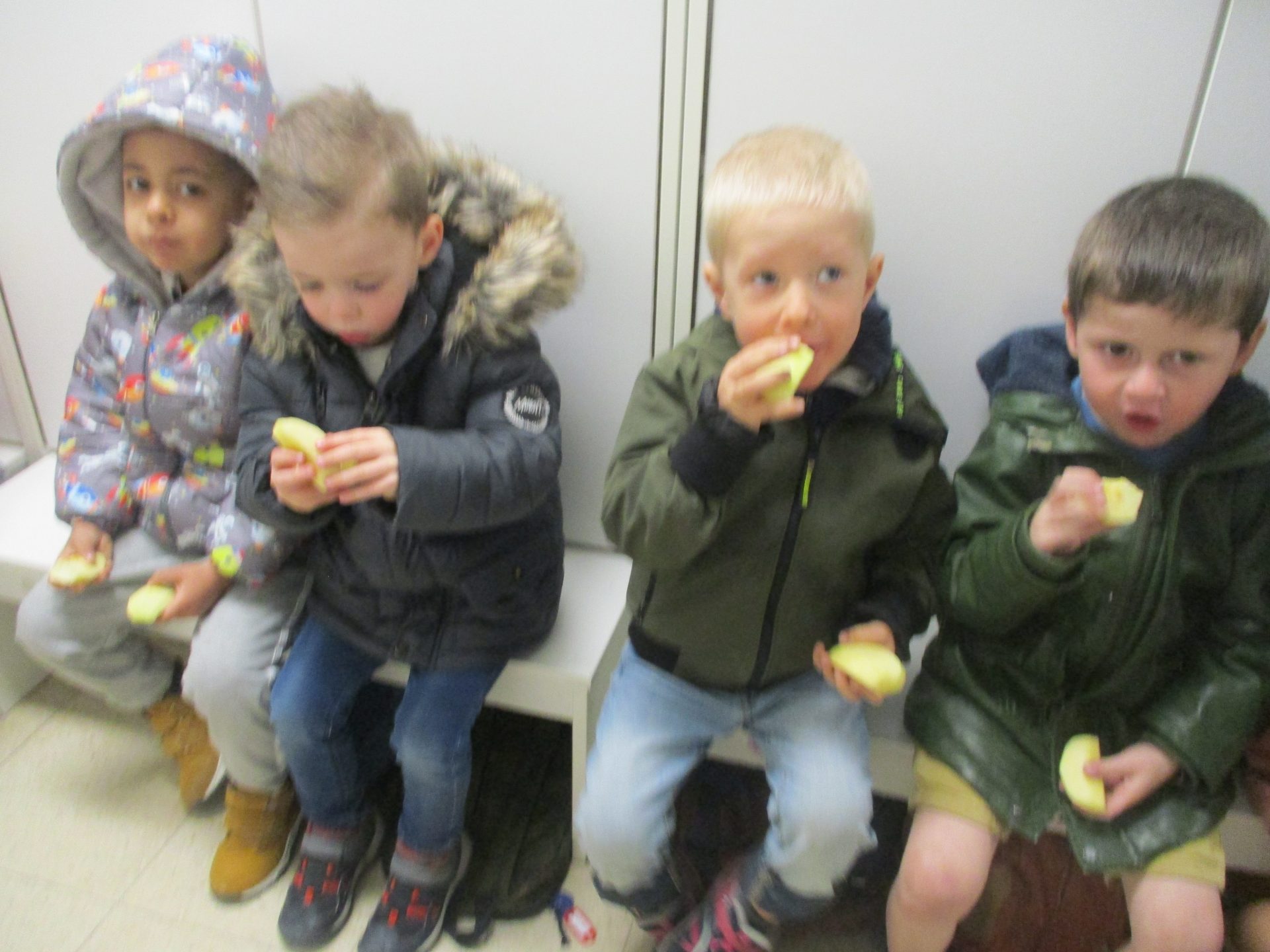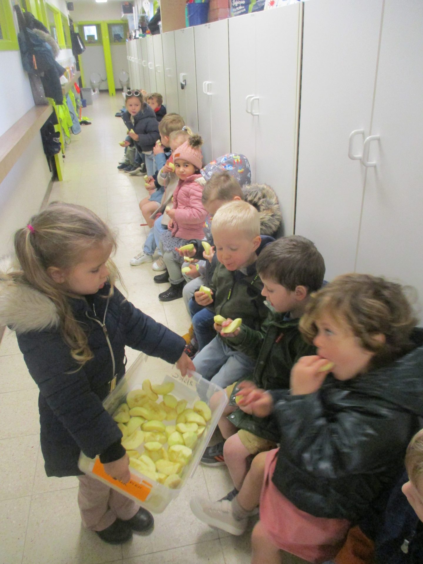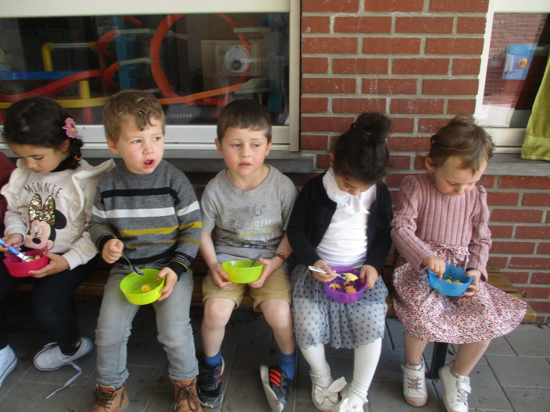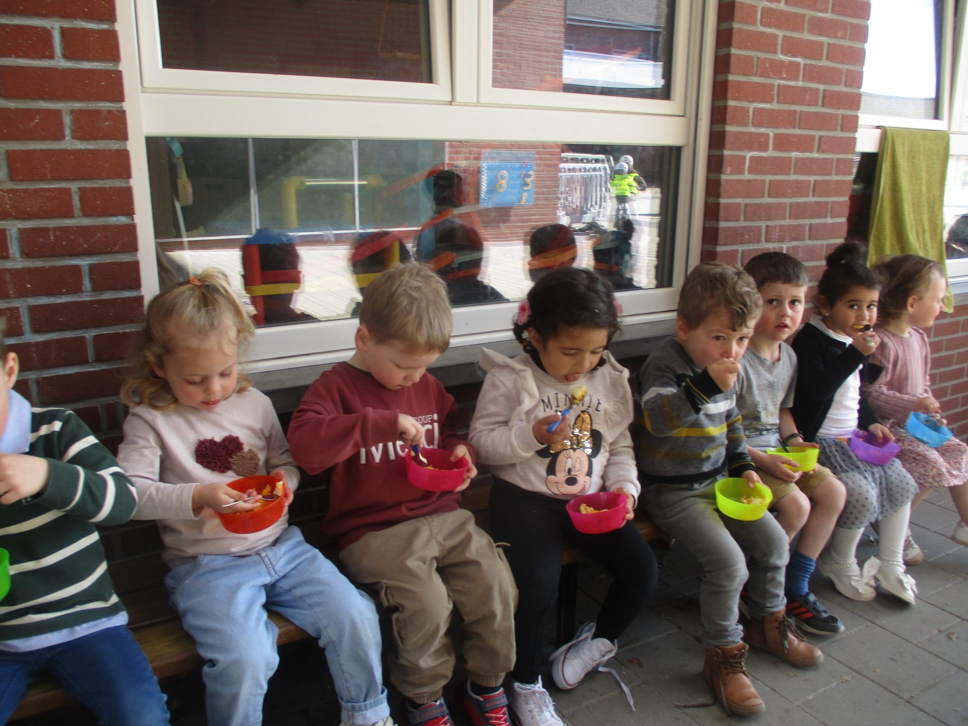 - Elke woensdag krijgen we en gezond tussendoortje (fruit/ groeten) van de ouderraad, telkens doen alle kleuters hun best om te proeven.