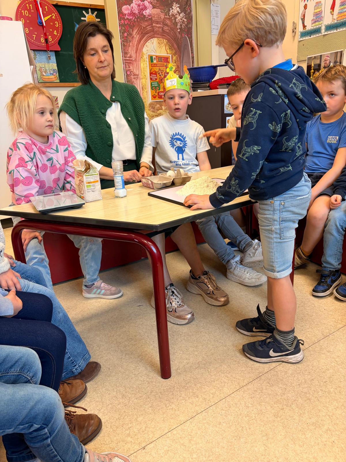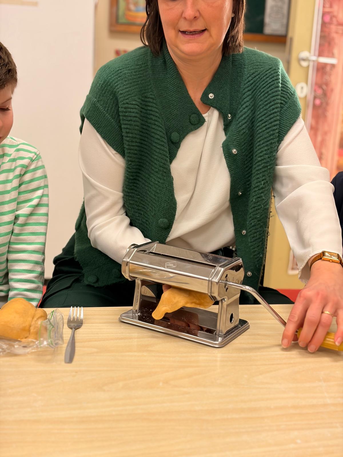 Weten jullie hoe je deeg maakt voor pasta? Wij wel. Meel, eieren en zout. En kneden maar. We hebben dit in 2x gedaan want het deeg die de juf kneedde was mislukt. Kan gebeuren, hĆ©! Juf had de dag erna deeg mee (thuis gemaakt zonder stress) en dan pasta maken met de machine. Heel verwonderlijk waren de kinderen dat uit die bol deeg pasta kwam. En dan koken en smullen maar! En wat zeiden de meeste kinderen : het is lekkerder dan thuis. Dus mama’s en papa’s en oma’s en opa’s… jullie weten wat jullie de volgende dagen eens moeten proberen.